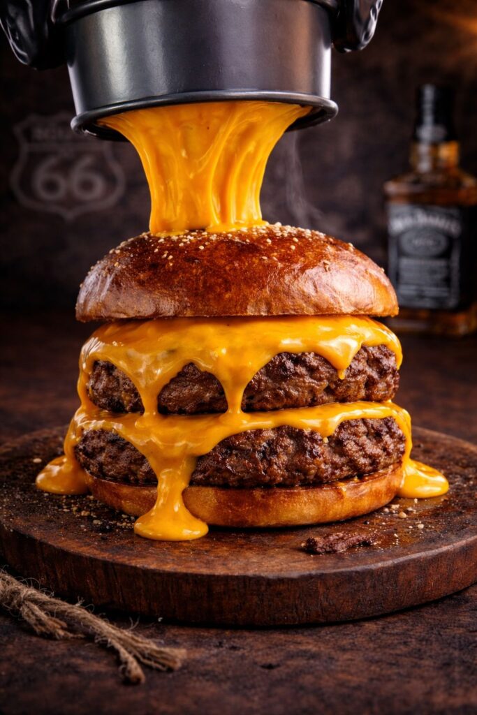 A tribute to the smoky soul of Missouri. Slow-smoked beef brisket slices, layered over a flame-seared beef patty and crowned with melted cheese. Finished with grilled onions and fresh herbs, all served in a toasted black sesame bun. Deeply smoky. Boldly American. A true Smokehouse classic on Route 66.