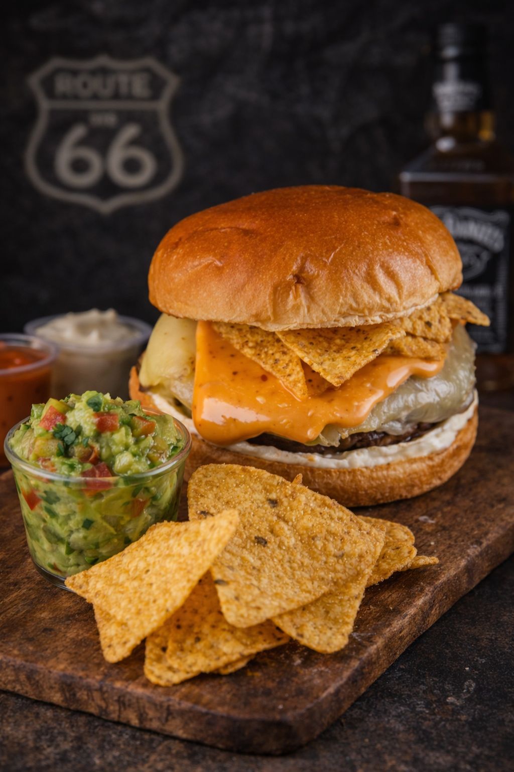 Juicy beef patty topped with melted cheese, crunchy nachos and sliced jalapeños.