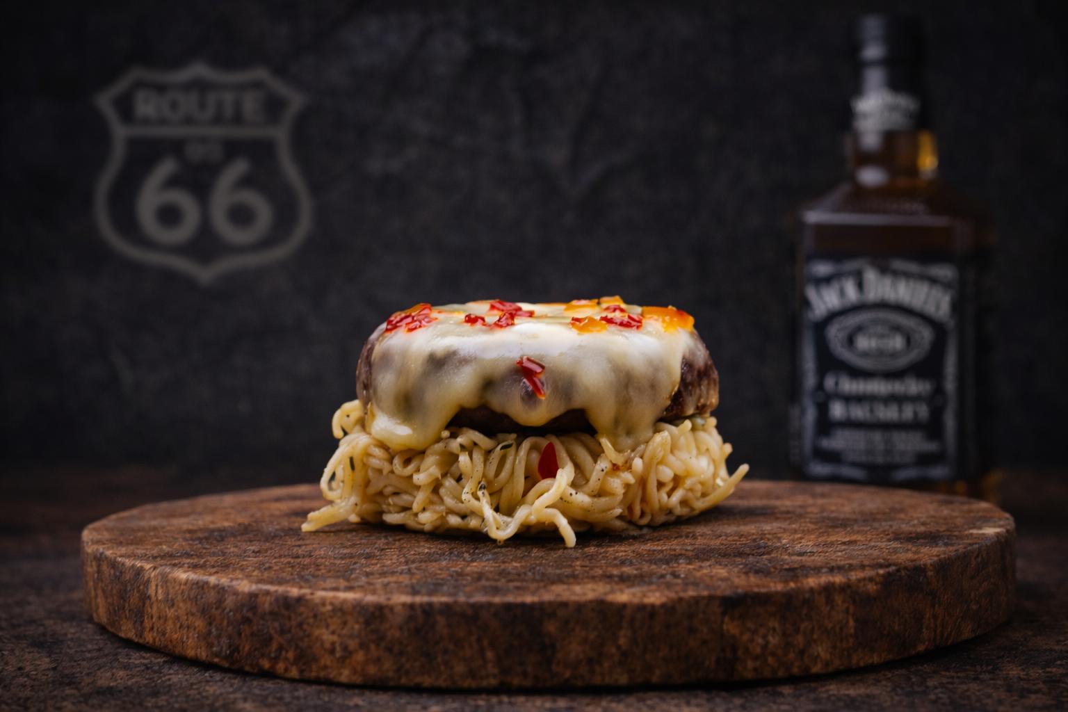 Crispy pressed ramen noodles replacing the traditional bun, stacked with a juicy beef patty, melted cheese and a hint of chilli heat.